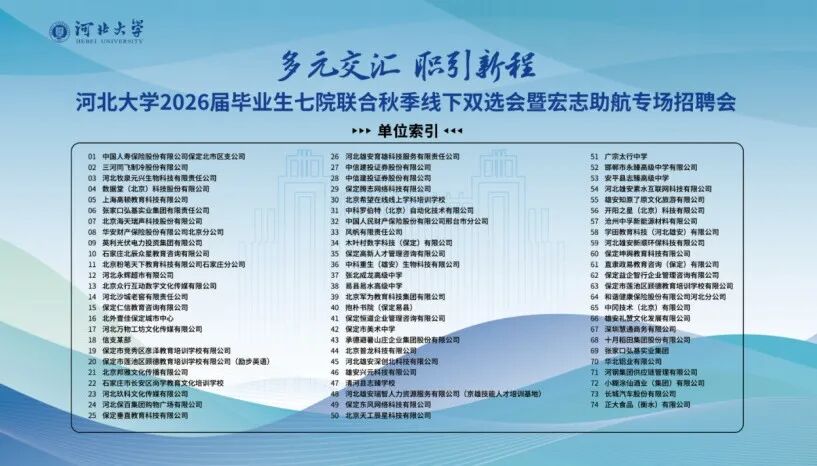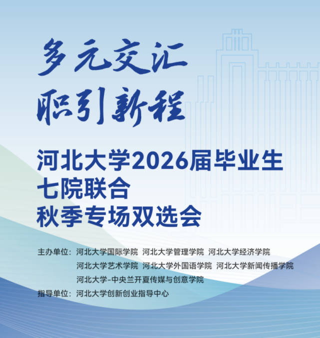 为深入贯彻党的二十大精神,落实党中央、国务院“稳就业”“保就业”决策部署,推动毕业生更高质量就业。2025年10月30日,河北大学国际学院、管理学院、经济学院、艺术学院、外国语学院、新闻传播学院、河北大学-中央兰开夏传媒与创意学院联合举办“多元交汇·职引新程”2026届毕业生七院联合秋季专场双选会。